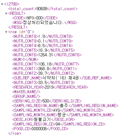 식품영양성분 DB의 데이터는 아래와 같은 구조를 가집니다. 영양성분은 <row id =... > 태그에 저장되어있기 때문에 xml->row로 <row> 태그에 접근하였습니다. 요청마다 여러 개의 <row> 태그가 존재하기 때문에 foreach 문을 통해 요청 시 받아온 모든 <row>에 대해 데이터 베이스 삽입 문을 실행합니다. 다른 형식의 XML 문서들을 파싱 하고자 하실 때에도 출력 결과를 살펴보고 적절한 태그로 접근해 데이터를 추출하시면 됩니다.