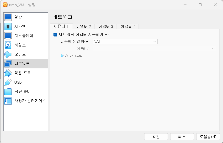 버추얼 머신에서 사용할 가상머신의 설정-네트워크 탭을 엽니다. 별도의 설정을 하지 않으셨다면 다음과 같이 나올 것입니다.