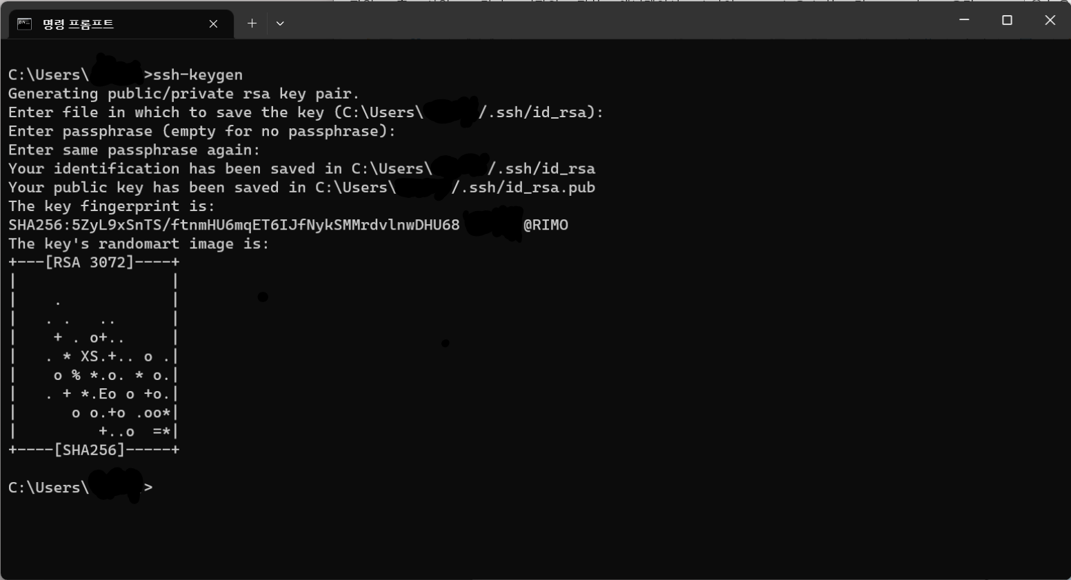 윈도우 기준 명령프롬프트를 열어 ssh-keygen을 입력합니다. 계속 엔터를 쳐주시면 다음과 같이 랜덤으로 키가 생성됩니다.