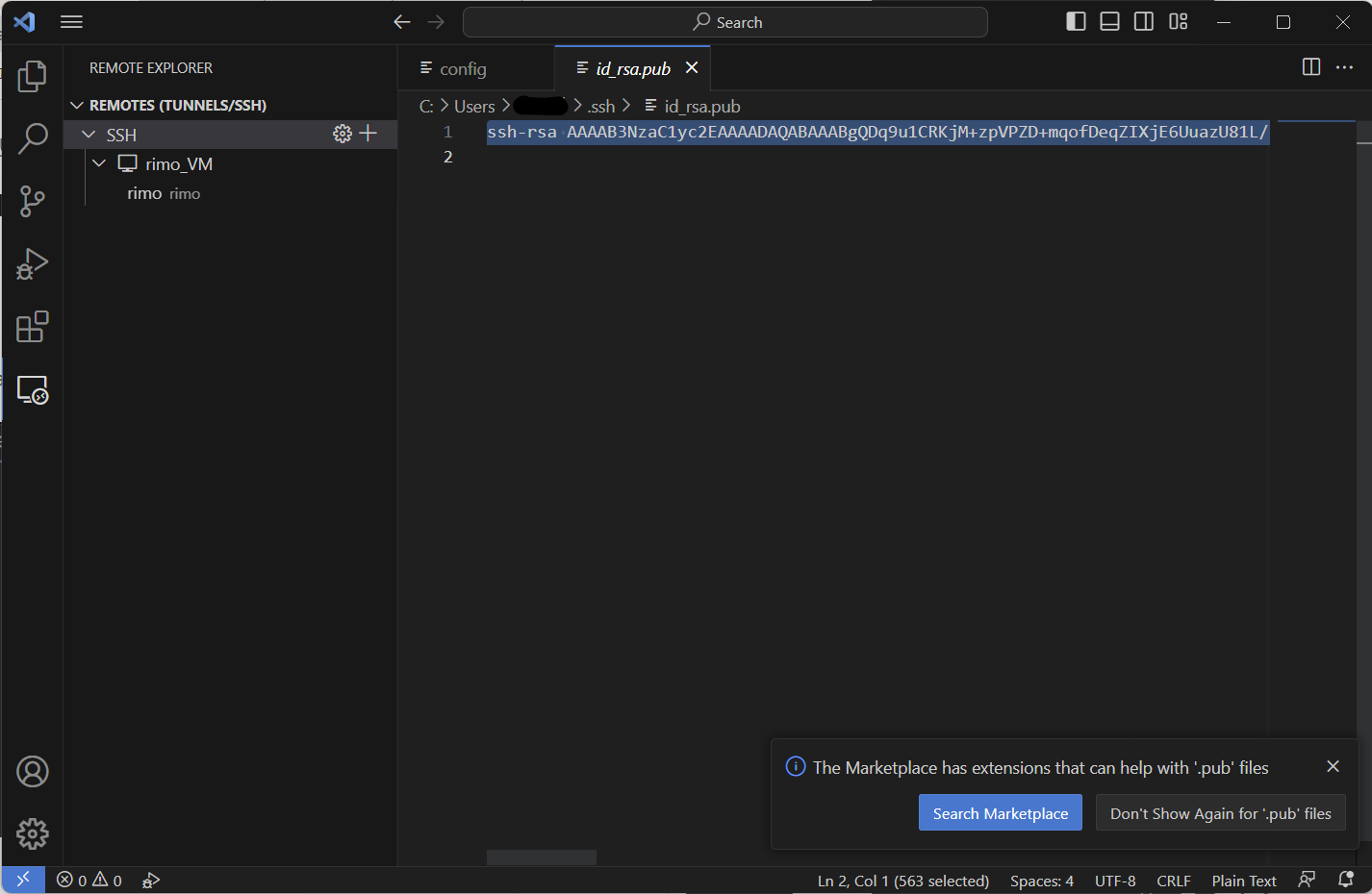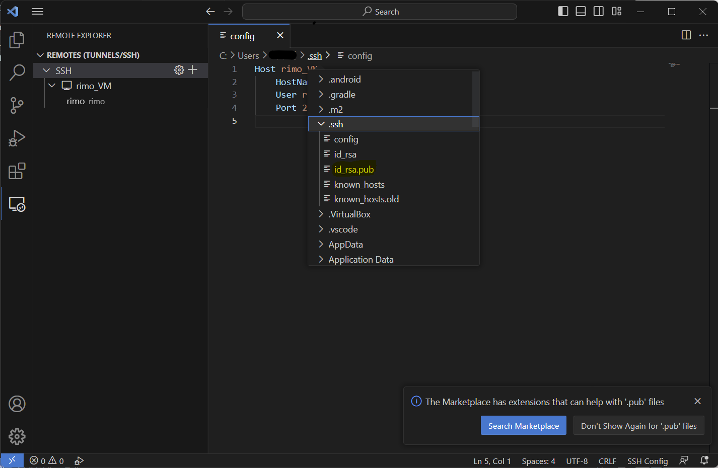VScode에서 .ssh폴더를 보면 [id_rsa]파일과 [id_rsa.pub] 파일이 생긴 것을 볼 수 있습니다.