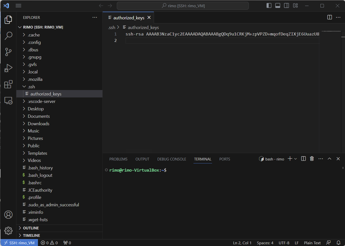 그리고 가상머신으로 넘어와서 [.ssh] 폴더에 [authorized_keys] 라는 이름을 가진 파일을 생성합니다.