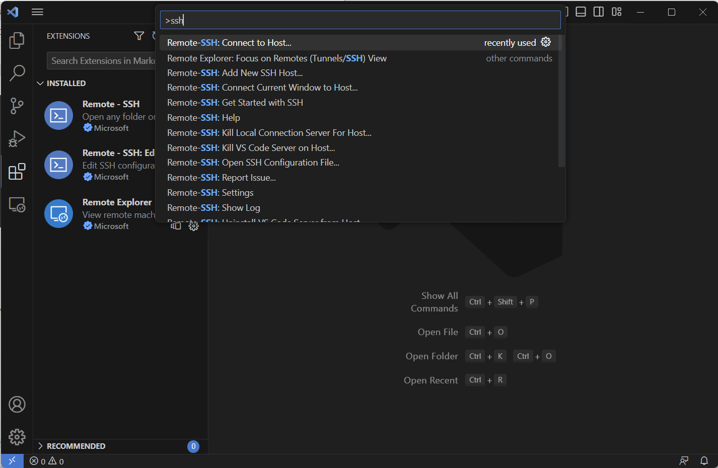 이어서 [F1]을 누르고 ssh를 입력 [Remote-SSH: Connect to Host...] 를 선택합니다.