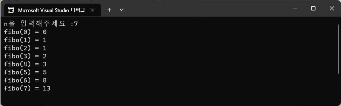 printf("fibo(0) = 0\n"); // fibo(0)값 출력