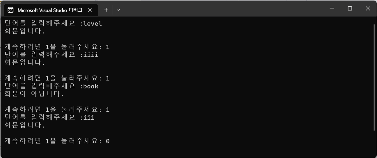덱의 삽입/삭제 연산을 구현하고 이를 이용해 입력된 문자열이 회문인지 판별합니다.