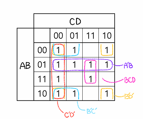 제시된 카르노 맵을 축약하여 아래와 같은 식을 얻었습니다.