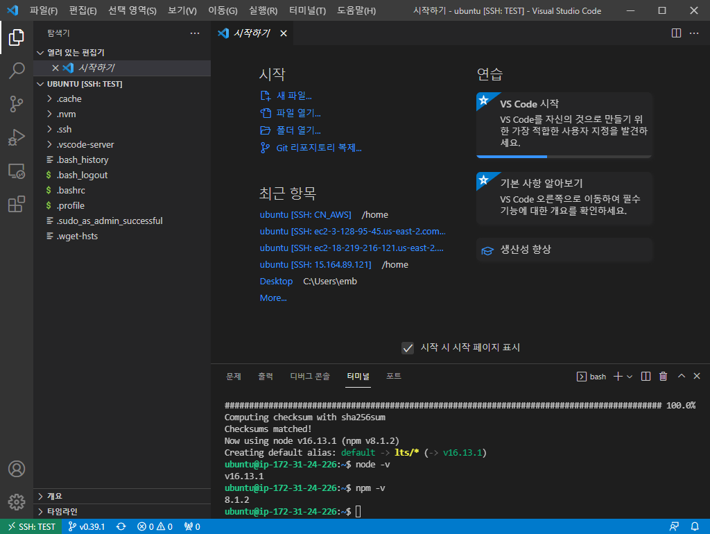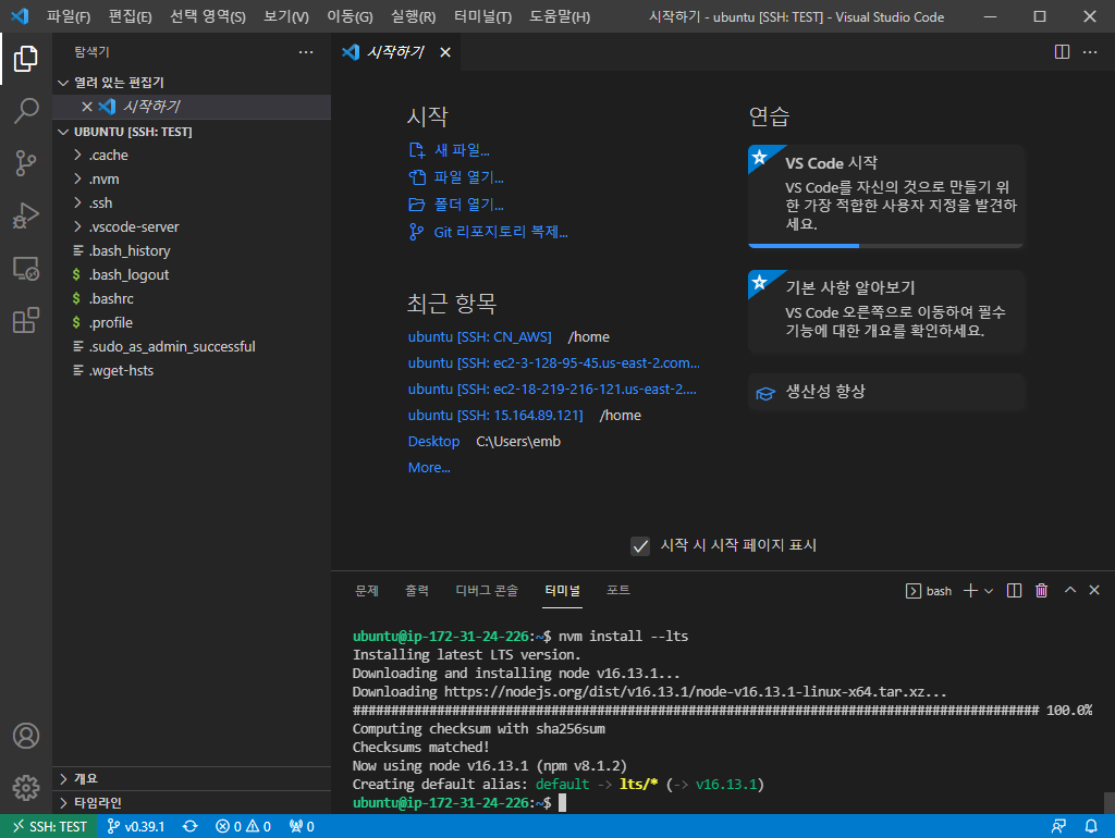 현재 LTS버전인 16.13.1가 잘 설치된 것을 확인할 수 있습니다.