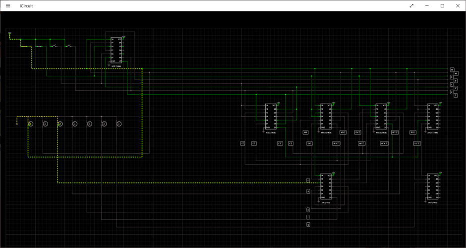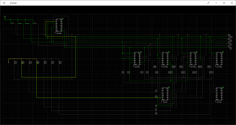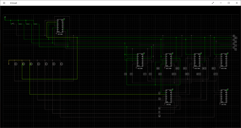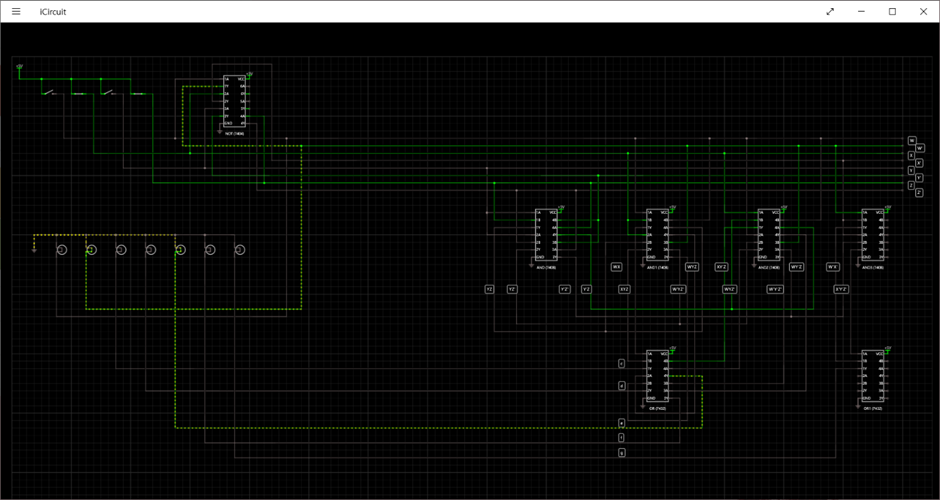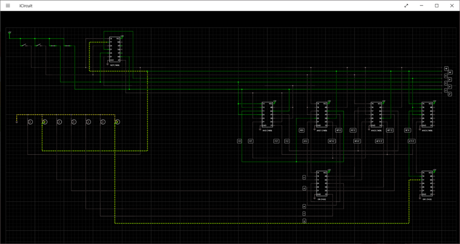 앞에서 생각한대로 먼저 Y와 Z를 사용하여 겹치는 부분을 만든 뒤, 7408, 7432칩을 사용하여 나머지 c,d,e,f,g의 결과도 전구와 연결시켜 주었습니다. 실수를 하지 않기 위해 식을 잘 살펴서 선 하나 하나를 연결했고, 다시 한번 확인한 뒤 메모를 달아 주었습니다. 덕분에 한번에 회로를 잘 작성할 수 있었던 것 같습니다.