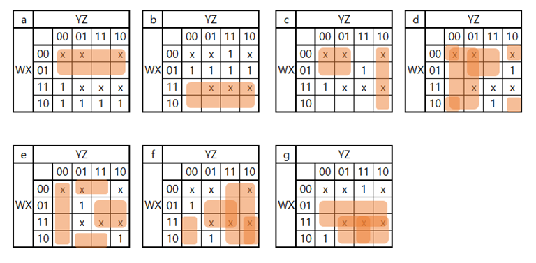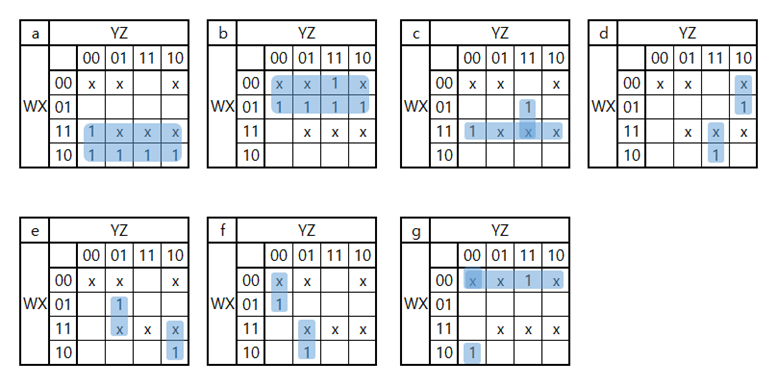 손으로 작성한 카르노 맵을 엑셀로 다시 그려본 것입니다. 이 카르노 맵을 사용하여 논리식을 구해본 결과는 아래쪽과 같습니다. 아래쪽의 경우도 살펴 보았지만 복잡도를 비교해 보았을 때, 위쪽의 논리식을 이 더 적은 게이트를 사용하기에 위쪽 논리식을 사용하여 회로 시뮬레이션을 해보기로 하였습니다. 또한, Y와 Z를 사용한 부분(YZ,Y’Z,YZ’,Y’Z’)이 겹치는 것이 보여 이 부분의 회로를 미리 만들고 진행하는 것이 좋겠다고 생각이 들어 표시를 해둔상태로 회로를 시뮬레이션을 시작했습니다.