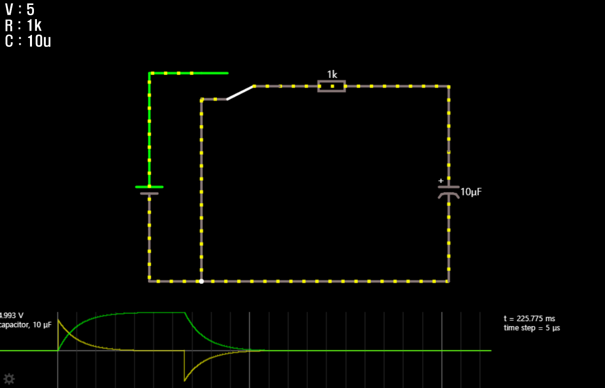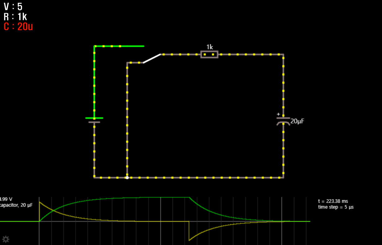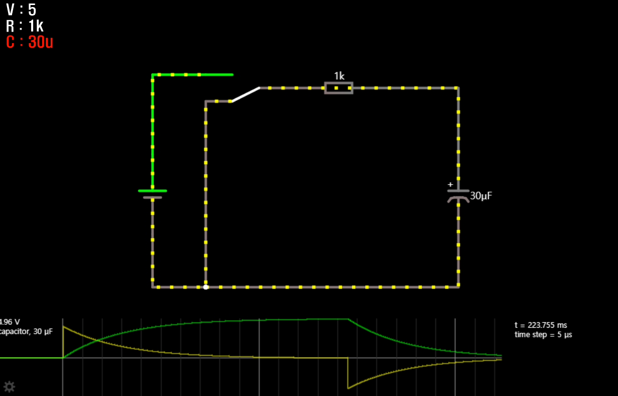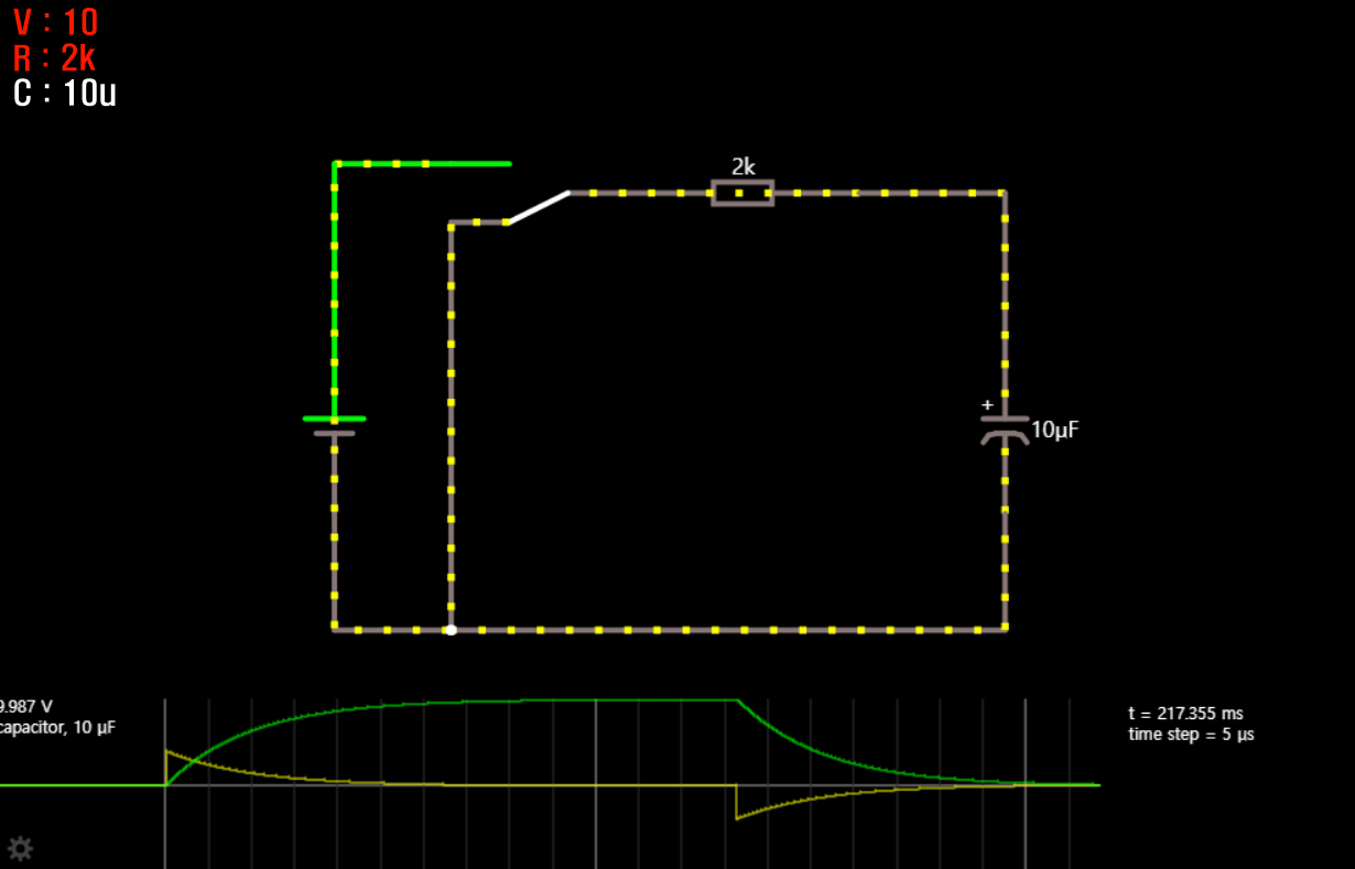 저항과 캐패시터를 사용하여 충전 및 방전회로를 시뮬레이션 해보았습니다.