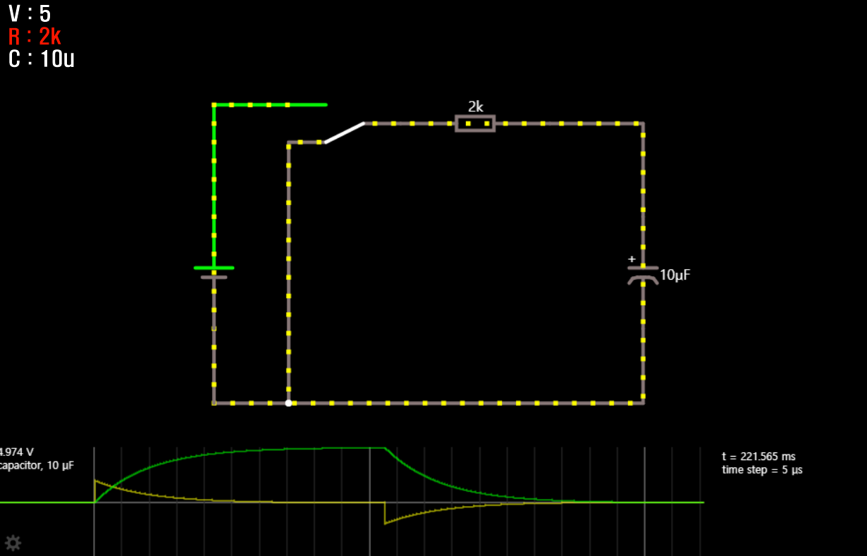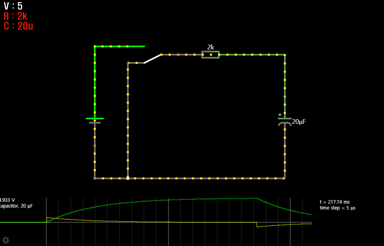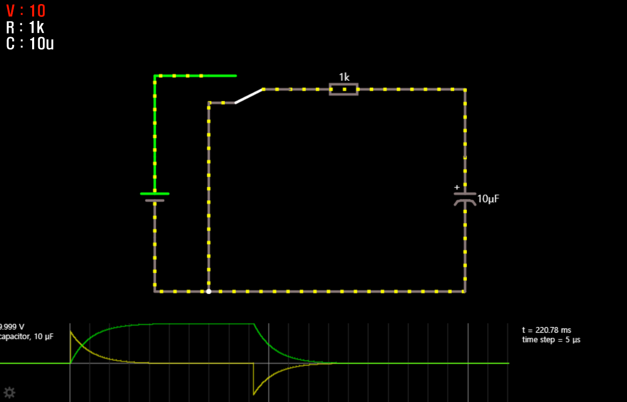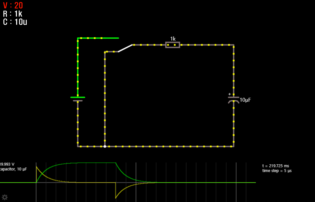 저항과 캐패시터를 사용하여 충전 및 방전회로를 시뮬레이션 해보았습니다.
