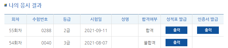 2021년에 진행한 54회, 55회 2회의 시험을 보았고 결과는 아래와 같습니다.