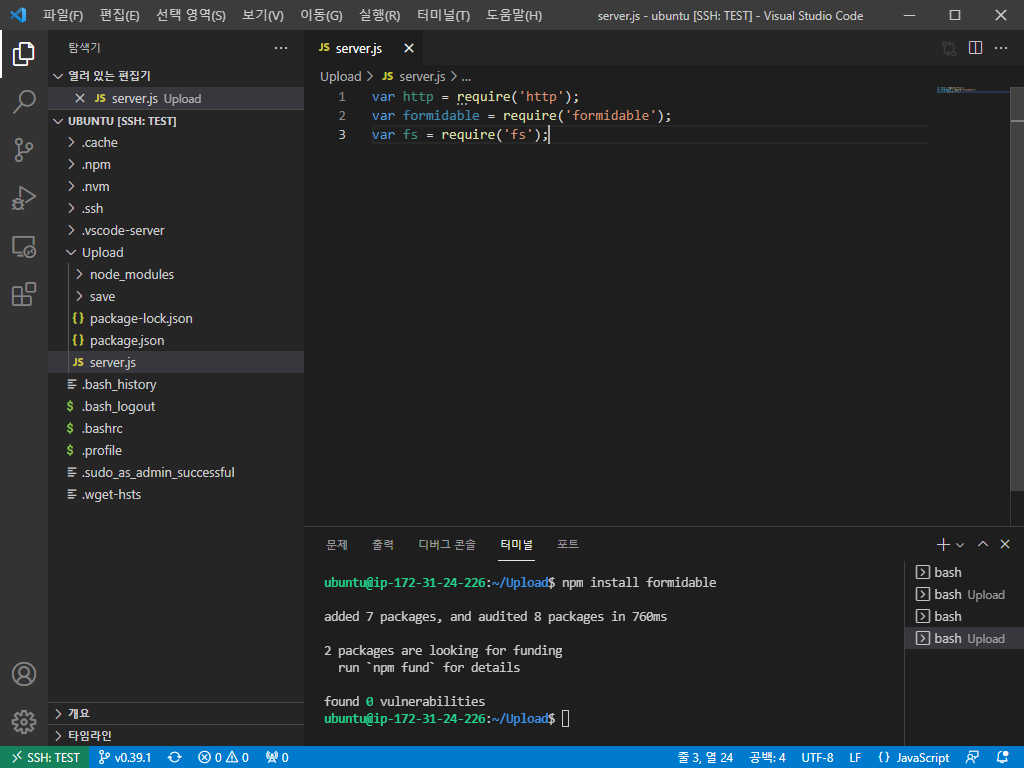 formidable 모듈은 내장되어있지 않기 때문에 추가 설치가 필요합니다.