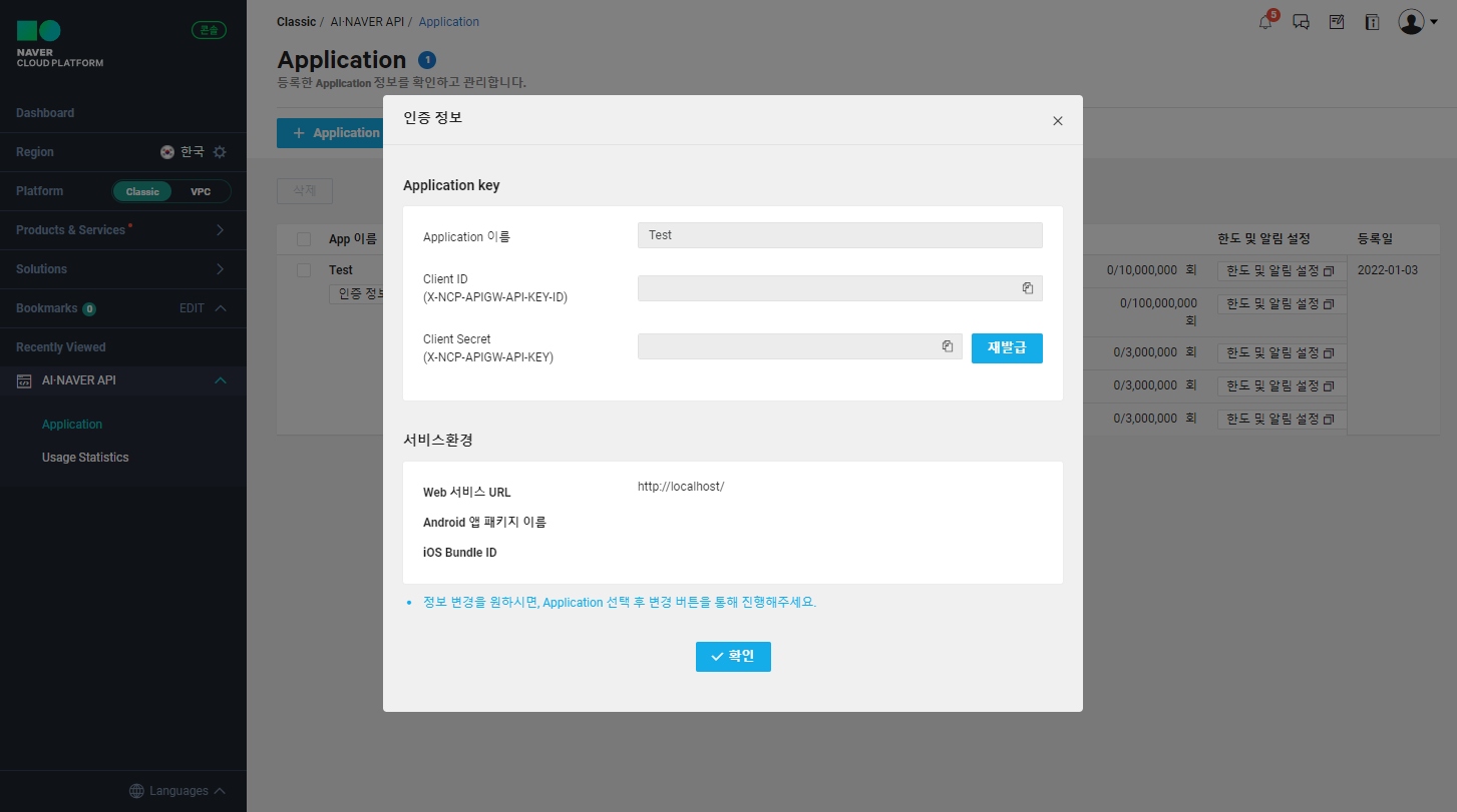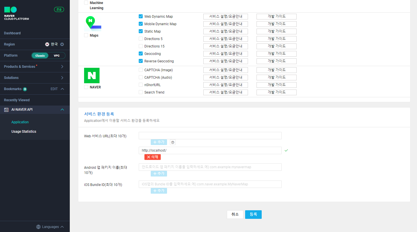 이 아이디를 사용해 등록한 URL에서 API를 사용할 수 있습니다.