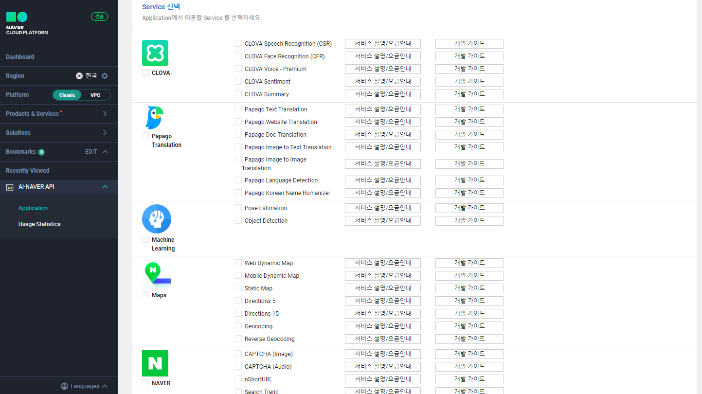 이제 사용할 서비스를 선택하면 됩니다.