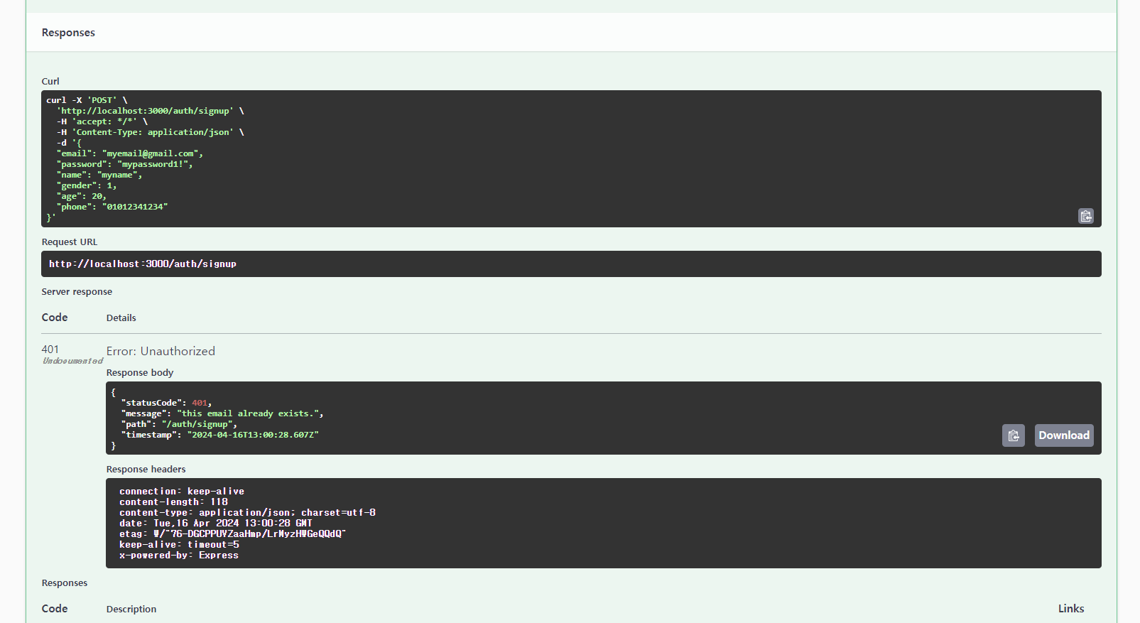 제 서버에는 이미 `myemail@gmail.com` 계정이 존재하기 때문에 에러가 응답으로 날아와야 합니다.
