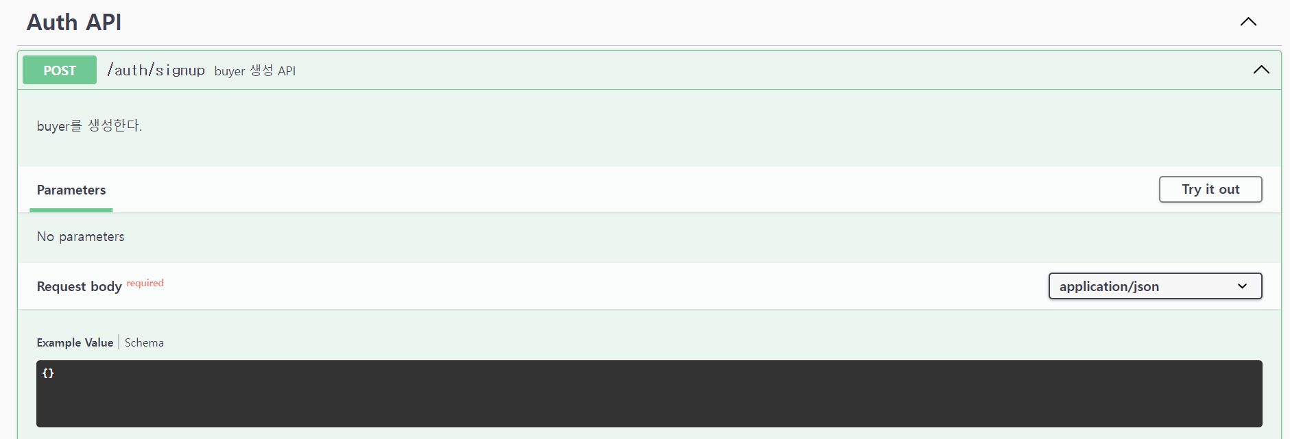 지금은 Request body가 비어있는데요. 이곳에 요청 DTO에 대한 정보를 추가해 보겠습니다.