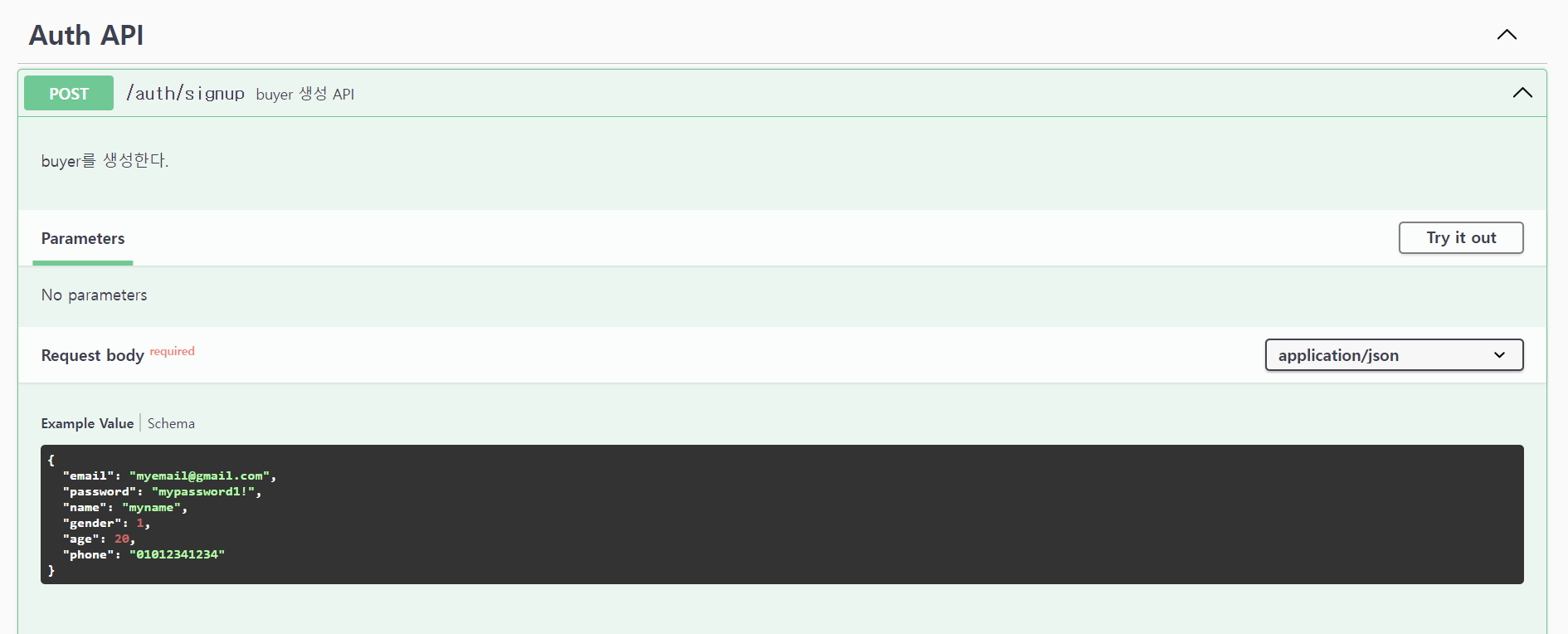 이제 Request body에서 DTO에 대한 예시 및 정보를 확인할 수 있습니다.
