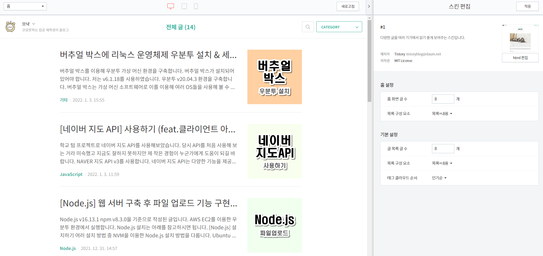 그럼 다음과 같은 스킨 편집 페이지가 열립니다.