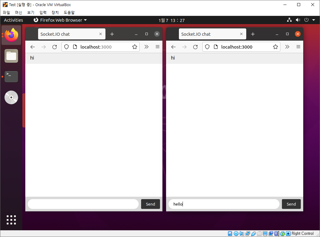 브라우저를 여러 개 켜 채팅을 진행해 보았습니다.