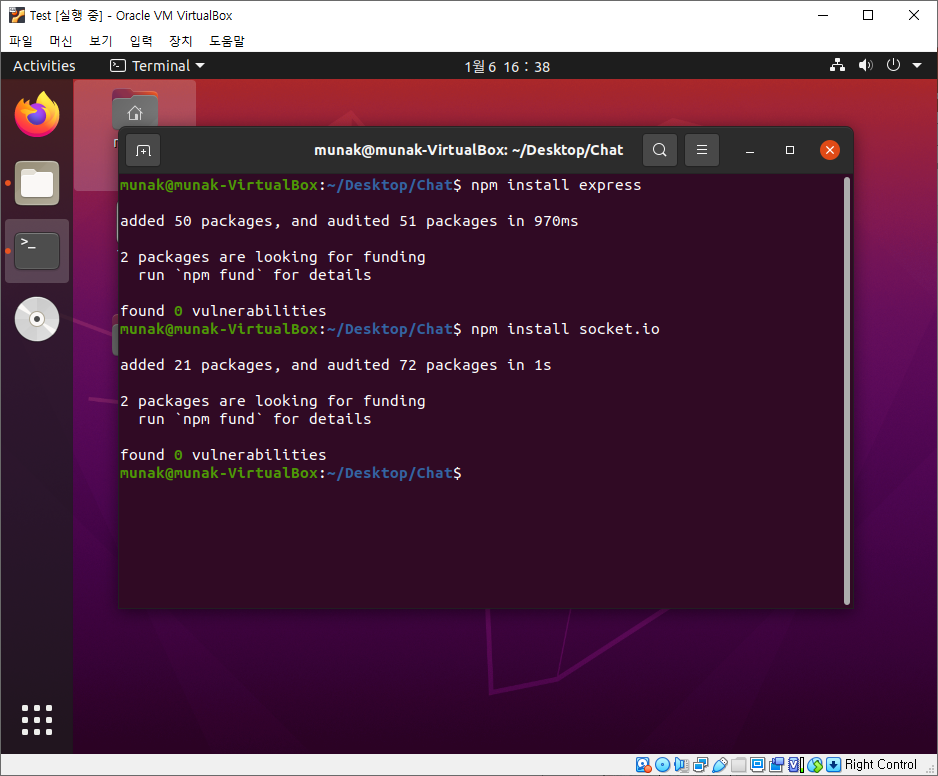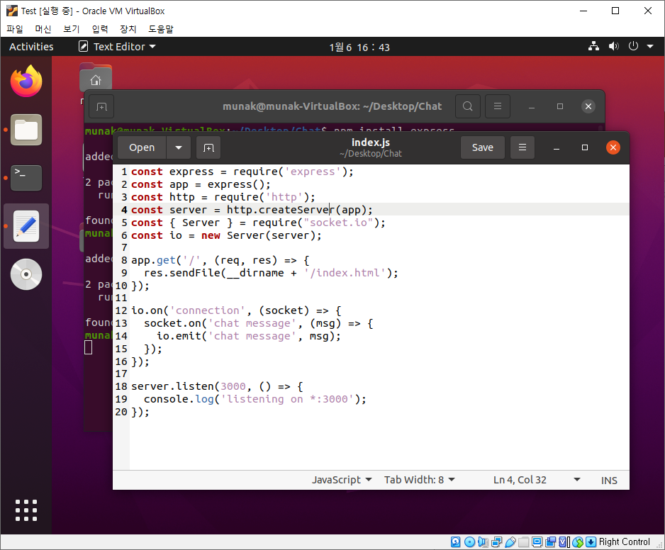 해당 폴더에서 터미널을 열어 Express와 Socket.IO를 설치합니다.