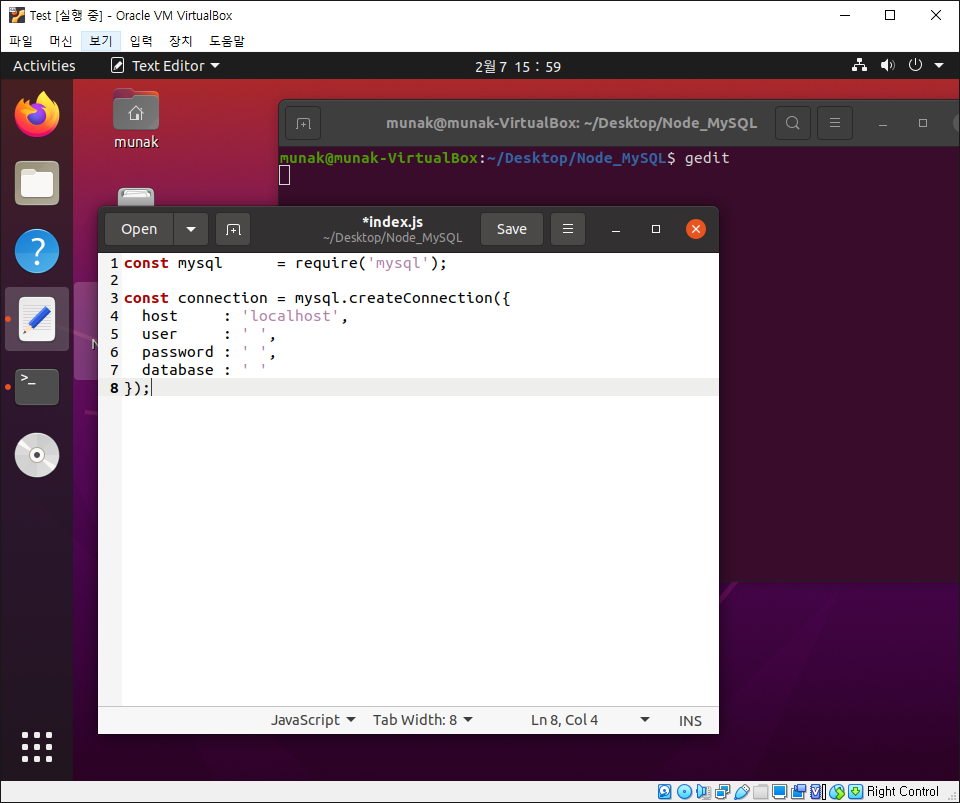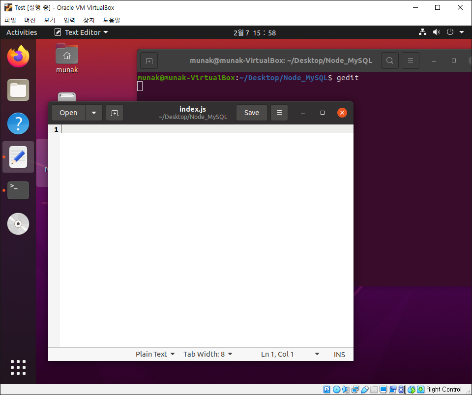그리고 js파일을 하나 만들어 해당 폴더에 저장합니다. 저는 gedit를 사용하겠습니다.