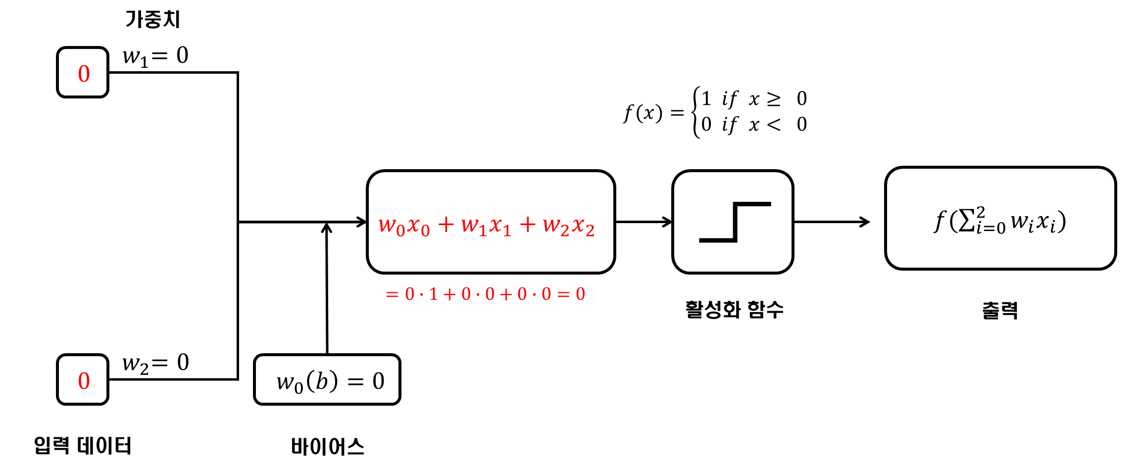 먼저 가중치와 바이어스를 0이나 작은 난수로 초기화합니다. 저는 계산의 편리함을 위해 0을 사용했습니다.