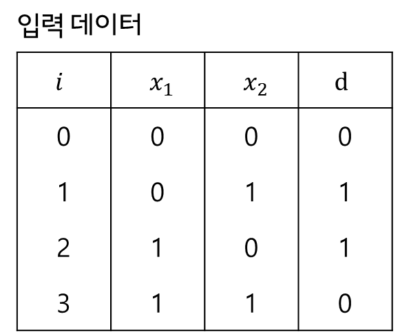 주어진 4개에 데이터에 대해 학습을 진행해 보았는데요. 이렇듯 제공된 모든 데이터에 대해 학습하는 단위를 에포크(epoch)라고 합니다. 현재는 1 에포크만큼 학습을 진행시킨 것이고 보통은 이 에포크를 여러 번 진행시켜 학습을 합니다. 저희는 위 알고리즘대로 가중치가 변하지 않을 때까지 학습을 진행시켜보겠습니다.