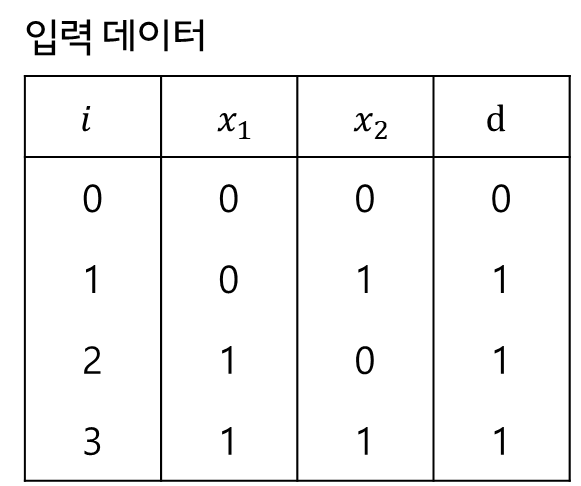 4 에포크를 진행하니 더 이상 가중치가 변경되지 않으면서 정확한 값이 출력되는 것을 확인할 수 있습니다. 퍼셉트론 알고리즘을 통해 AND 연산이 학습된 것입니다.
