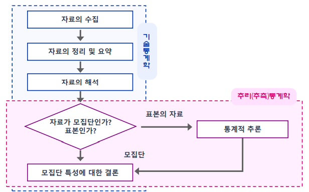 통계적 추론 : 표본으로 부터 얻을 결과를 이용하여 모집단의 특성을 예측하는 과정을 말한다. 추정과 가설 검정을 포함한다.