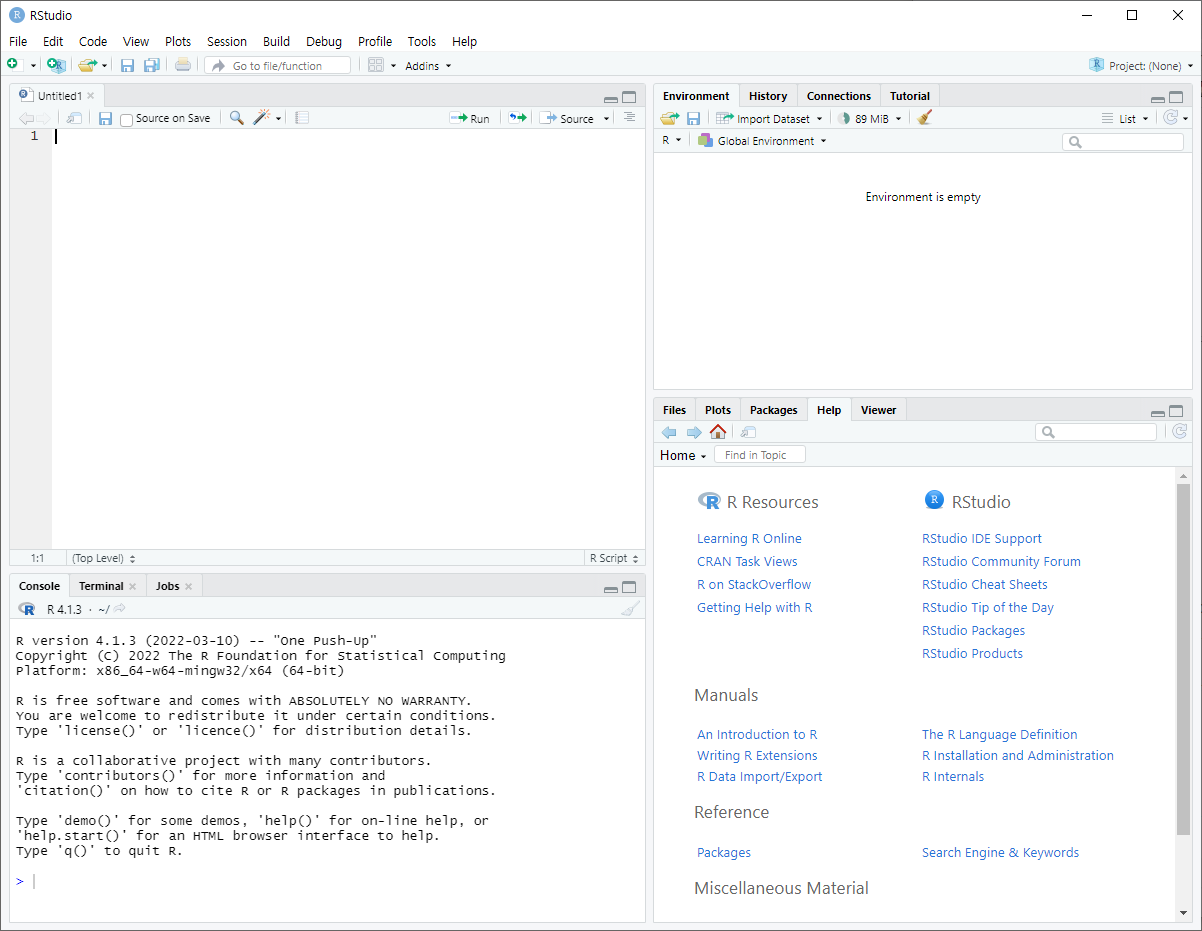 R, RStudio, jdk를 설치합니다. R-4.1.3, RStudio-2022.02.1-461, JDk 8 버전을 사용합니다. + 다른 자바 버전이 설치되어 있는 경우 충돌 오류가 날 수 있습니다. R프로그래밍 환경을 구축합니다. [R설치] https..