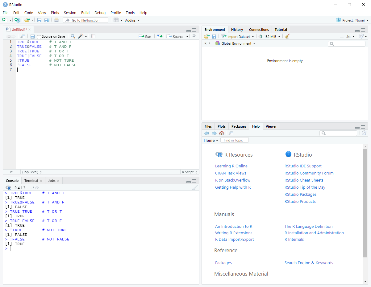 TRUE, FALSE (예약어) --> 참/거짓 &, | (논리연산자) --> AND, OR