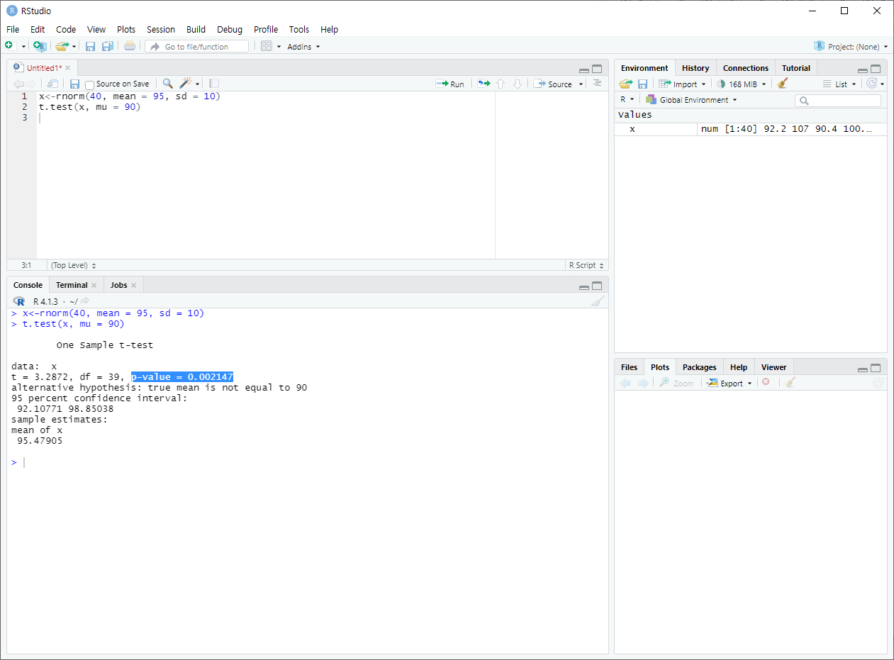 --> p-값이 0.05보다 작기 때문에 평균이 90이라는 가설은 기각한다.