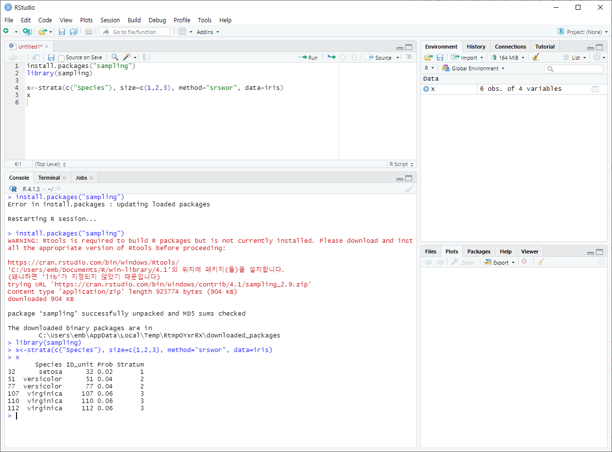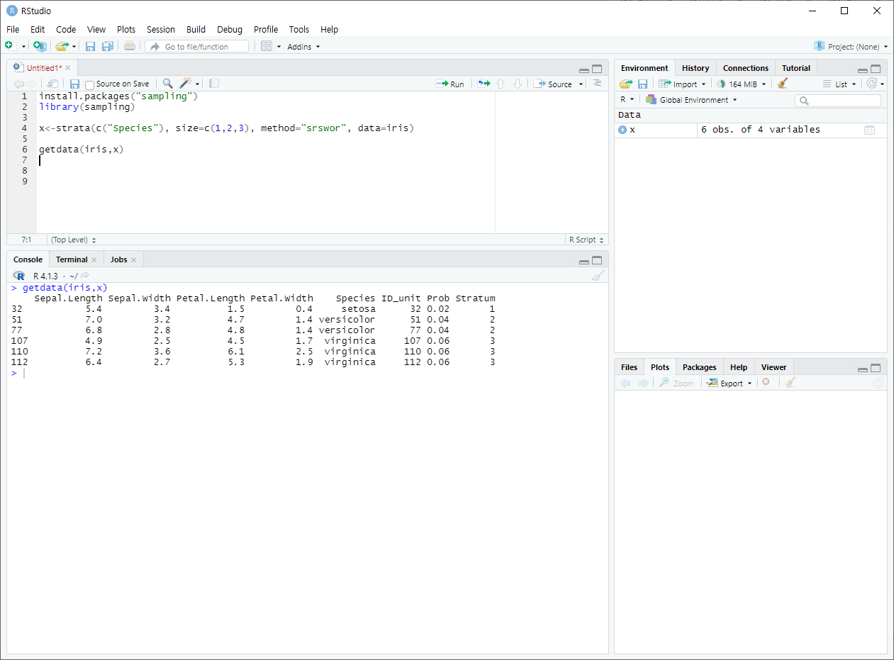ex. R에 내장되어있는 iris데이터에서 단순 임의 추출(비복원)을 실행하는 예제. "Species"별로 1~3개의 데이터 추출.