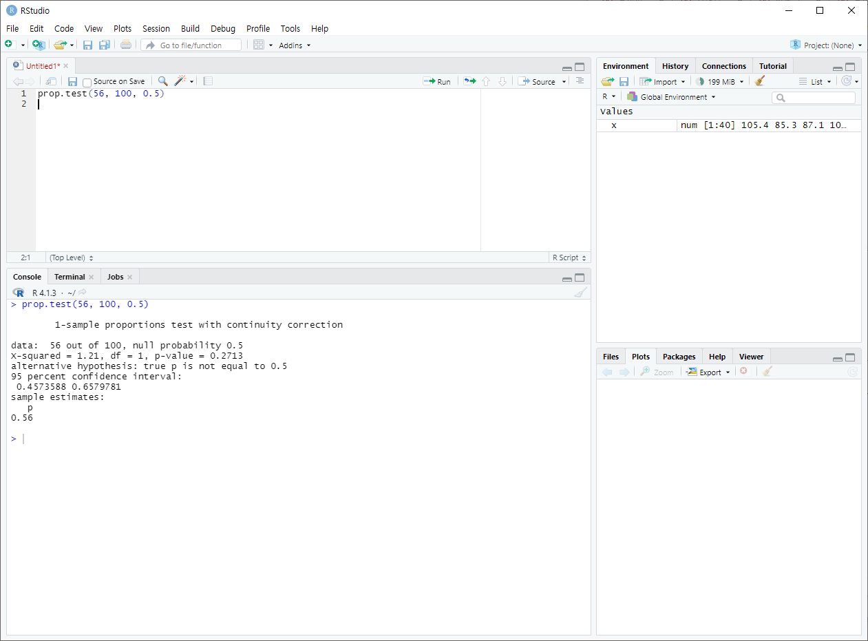 ex. 100 경기 중 56번 이겼을 때, 앞으로의 경기에서 절반 이상을 이길 수 있을것인가? (귀무가설 P≤0.5) 라는 가설을 검증하는 예제