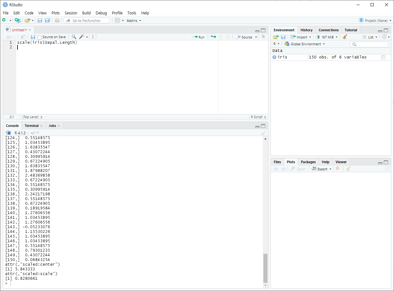 모든 원소에 대해 z점수를 계산한다. 벡터, 행렬, 데이터 프레임에서 사용가능하다.