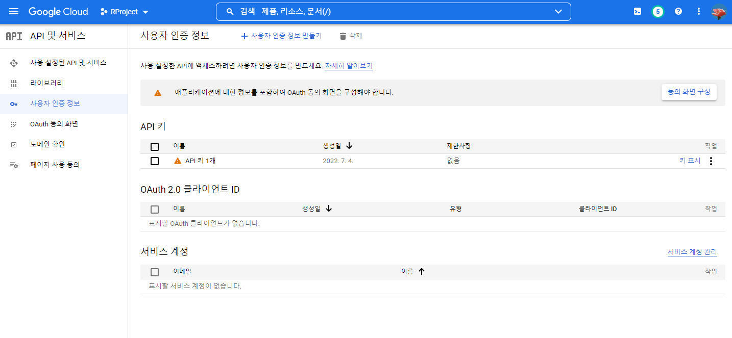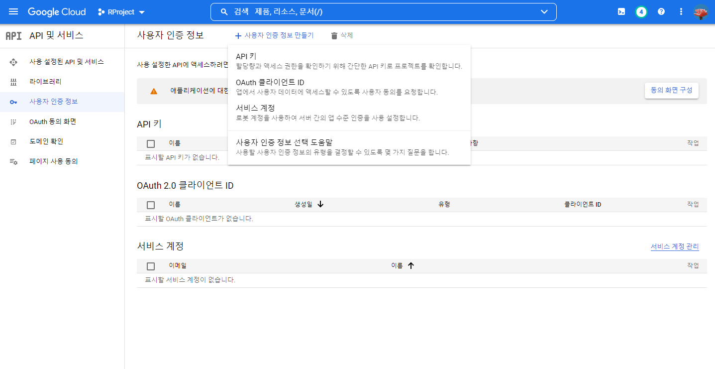 (위의 Google Maps에서 [사용자 인증정보]를 선택해 진행하셔도 무관합니다.)