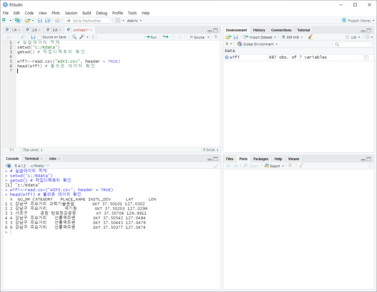 setwd( ) 함수를 통해 해당 폴더로 작업디렉토리를 바꾼뒤 csv 파일을 불러옵니다.