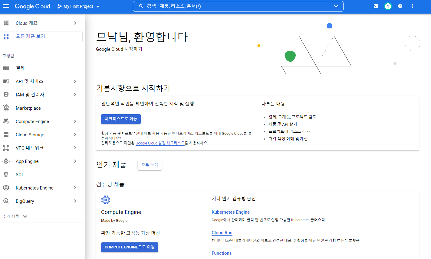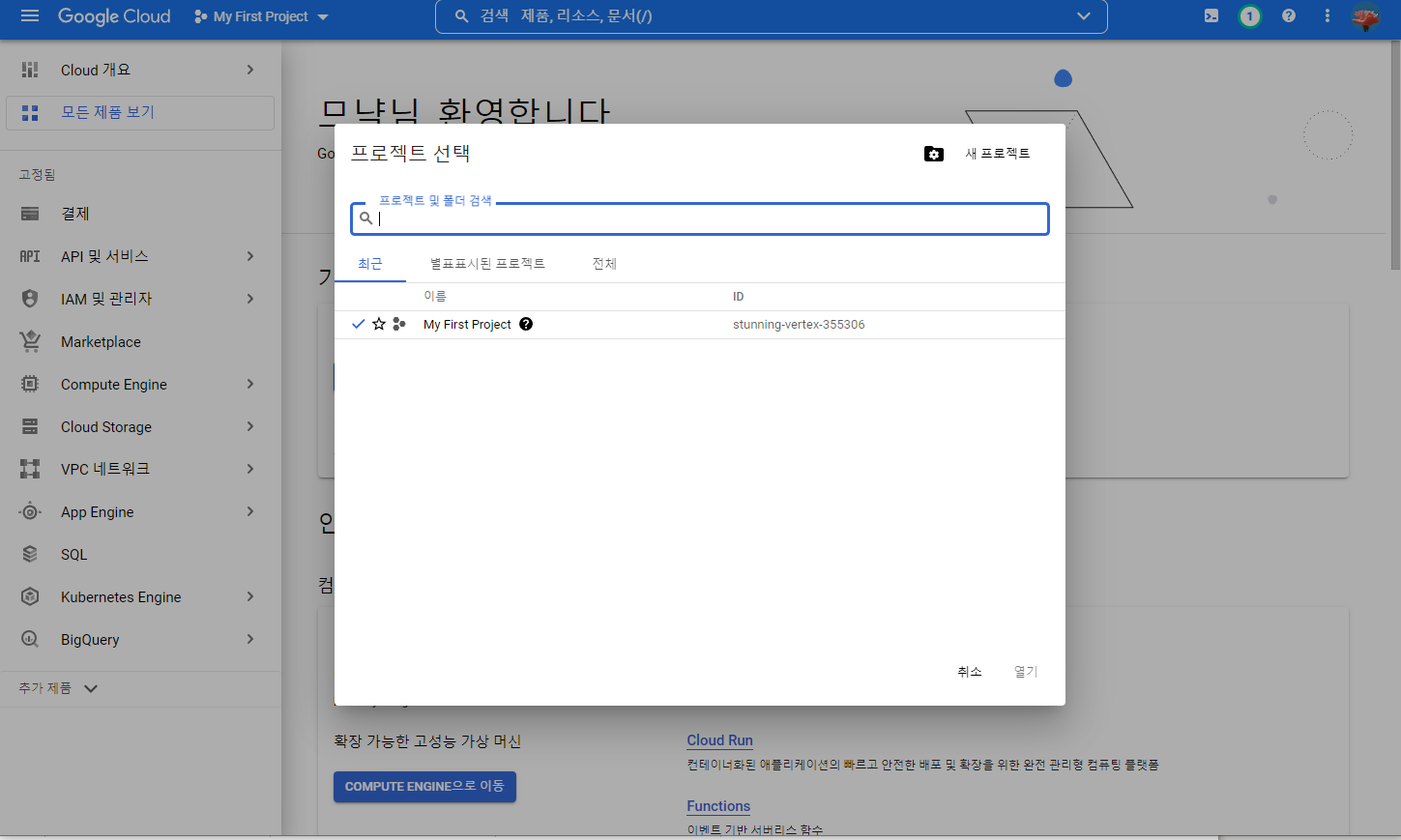 구글에 로그인 후 GCP(Google Cloud Platform)에 접속 합니다.