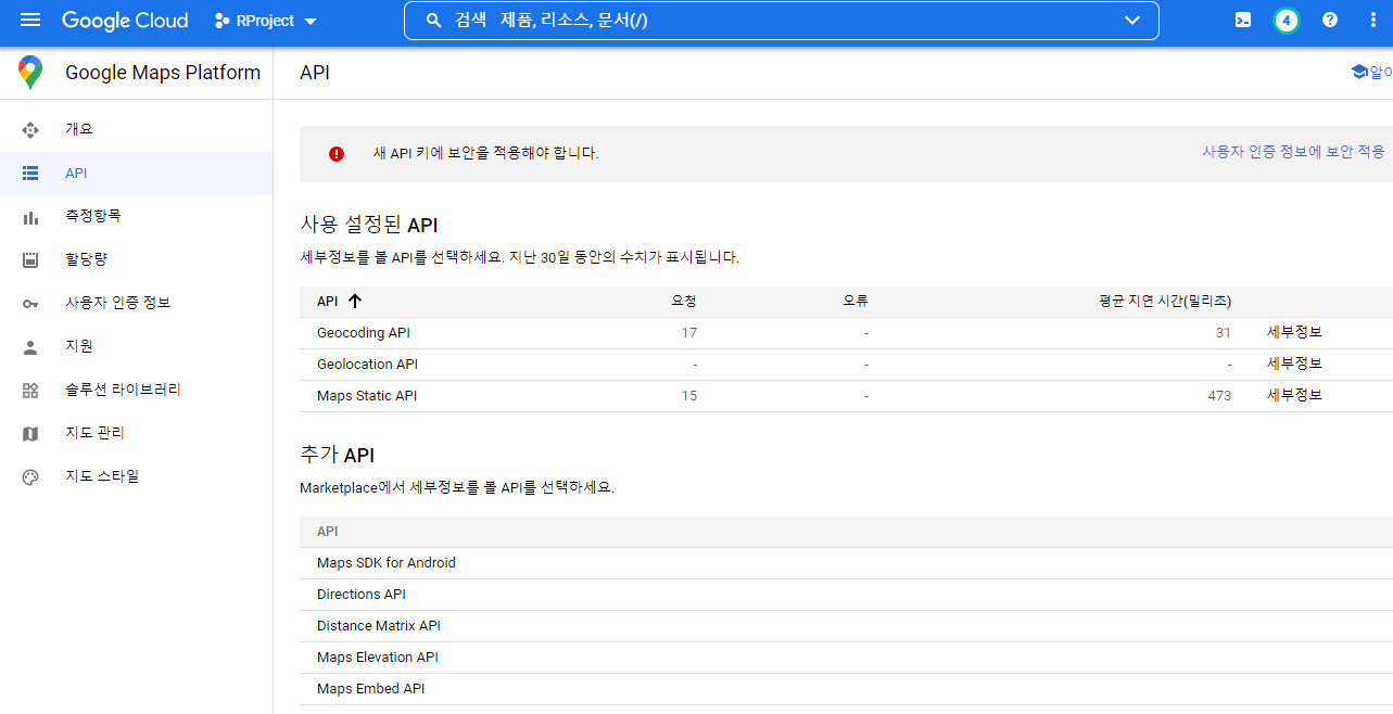 그럼 API키가 생성됩니다. 이제 이 키를 이용해 ggmap을 R에서 사용할 수 있습니다.