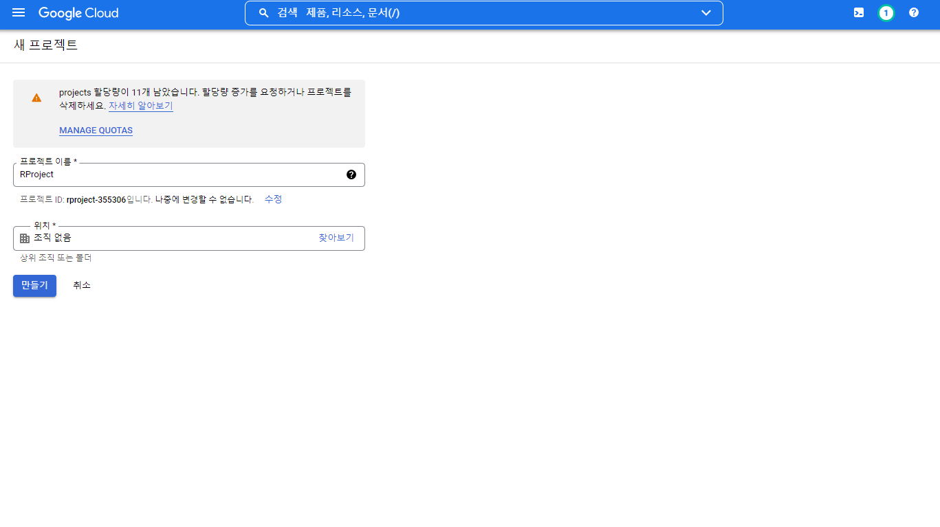 프로젝트의 이름을 임의로 작성하고 만들기를 선택하면 새로운 프로젝트가 만들어 집니다.