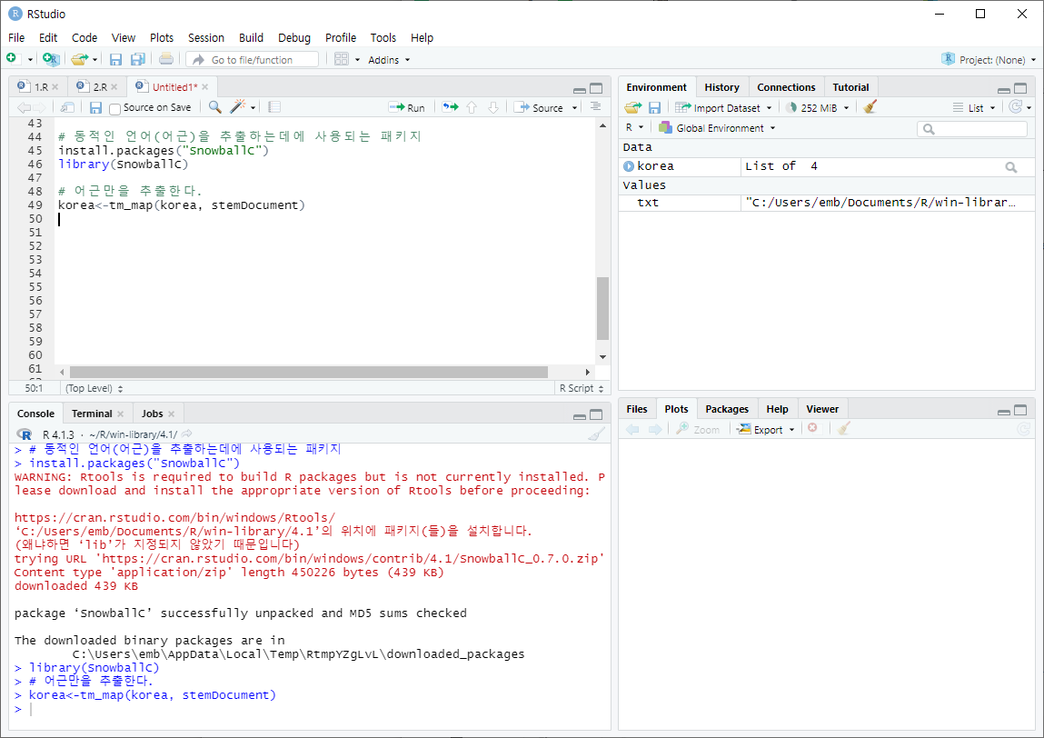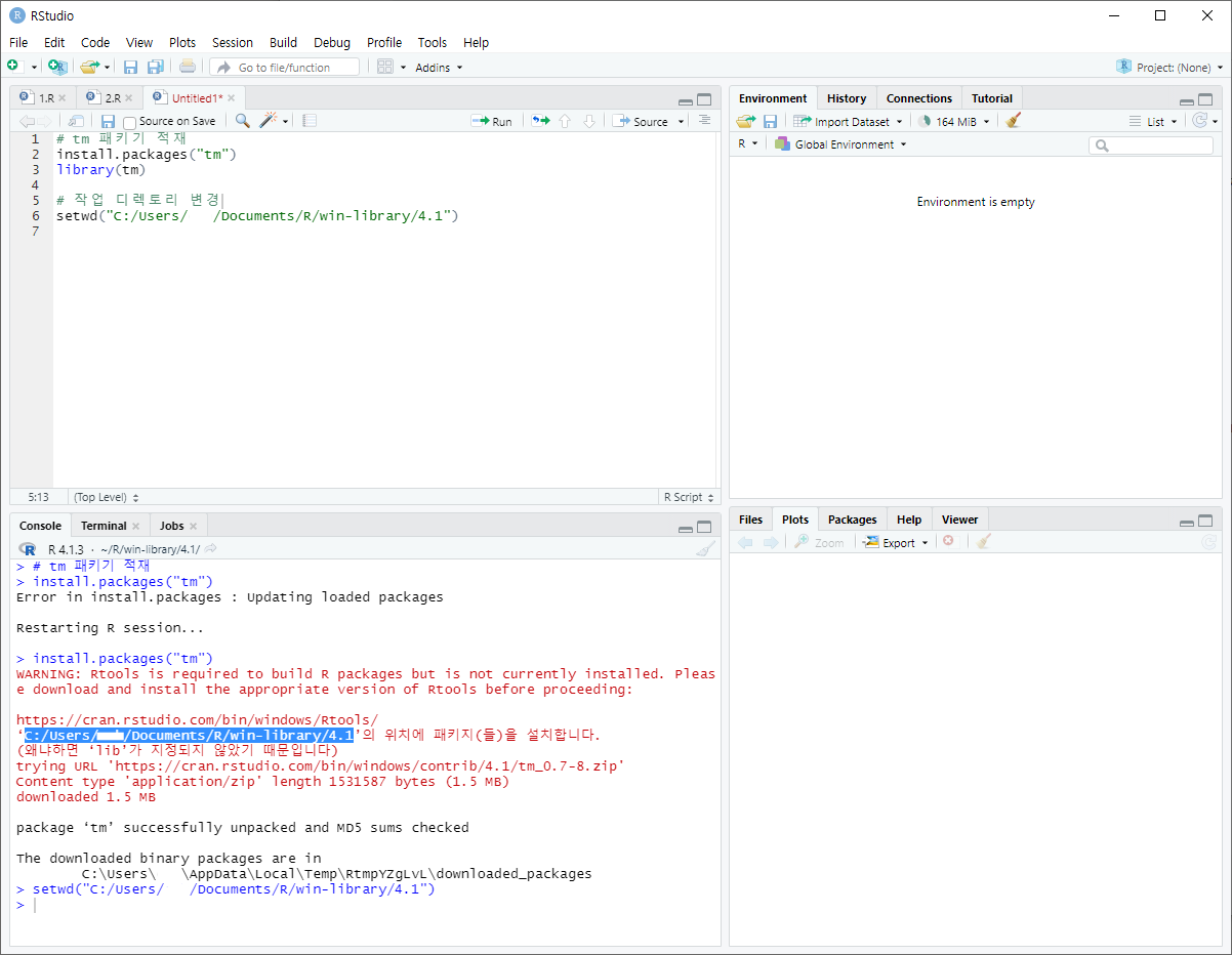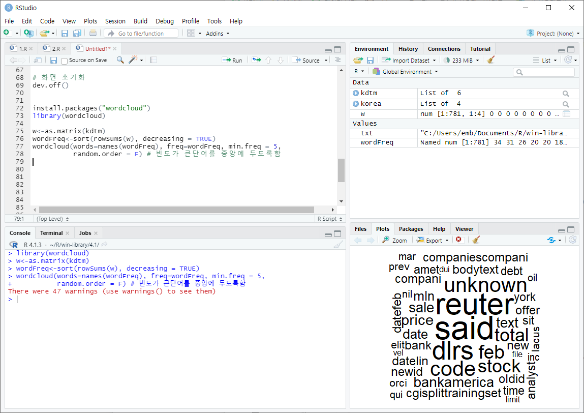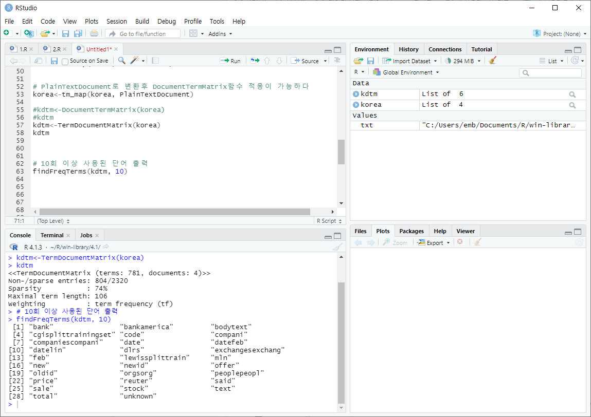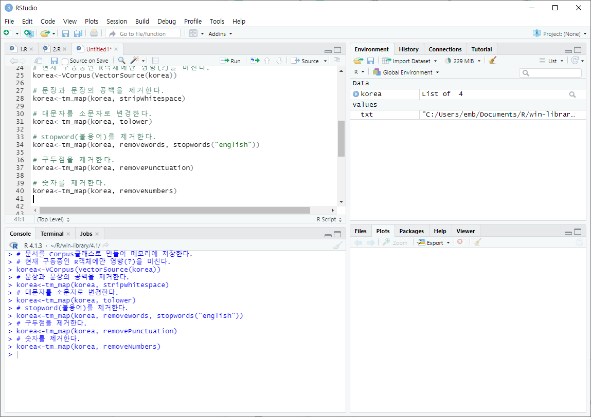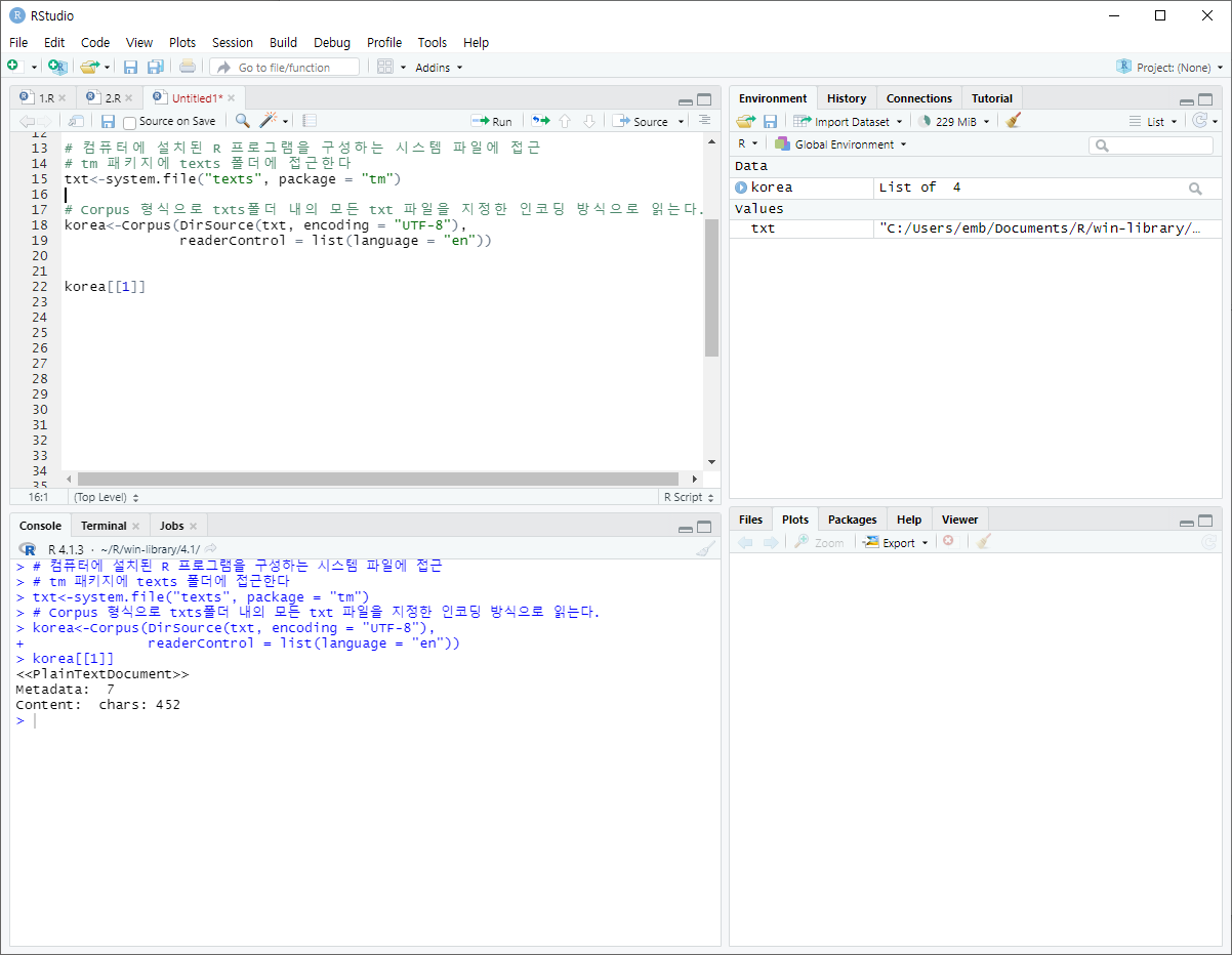 먼저 tm 패키지를 설치합니다. 이어서 패키지 내부에 있는 txt 파일을 사용해 Corpus 형식으로 데이터를 적재한 뒤 텍스트 마이닝을 실행해 보겠습니다. (작업 디렉토리를 tm패키지가 설치된 디렉토리로 설정해야합니다.)