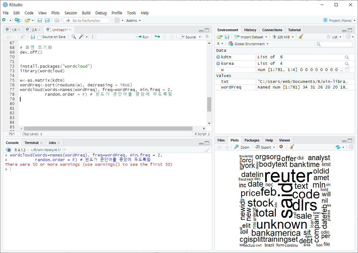 word cloud는 단어들을 구름모양으로 나열하여 시각화하는 패키지입니다.. 빈도가 높은 핵심단어일수록 가운데에 크게 표현되며 어떤 단어들이 자주 사용되었고 데이터에 어떤 의미들이 내포되어있는지 한눈에 알아볼 수 있어 유용합니다. 보통 색상관리를 위해 RCloreBrewer 패키지와 함께 사용됩니다.