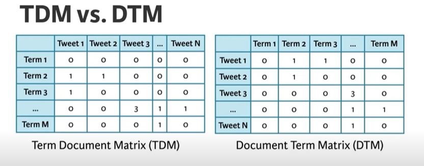 이어서 여러 문서에서 등장하는 각 단어들의 빈도를 행렬로 표현하는 작업이 필요합니다. DocumentTermMatrix(DTM) 함수나 TermDocumentMatrix(TDM) 함수를 이용합니다.