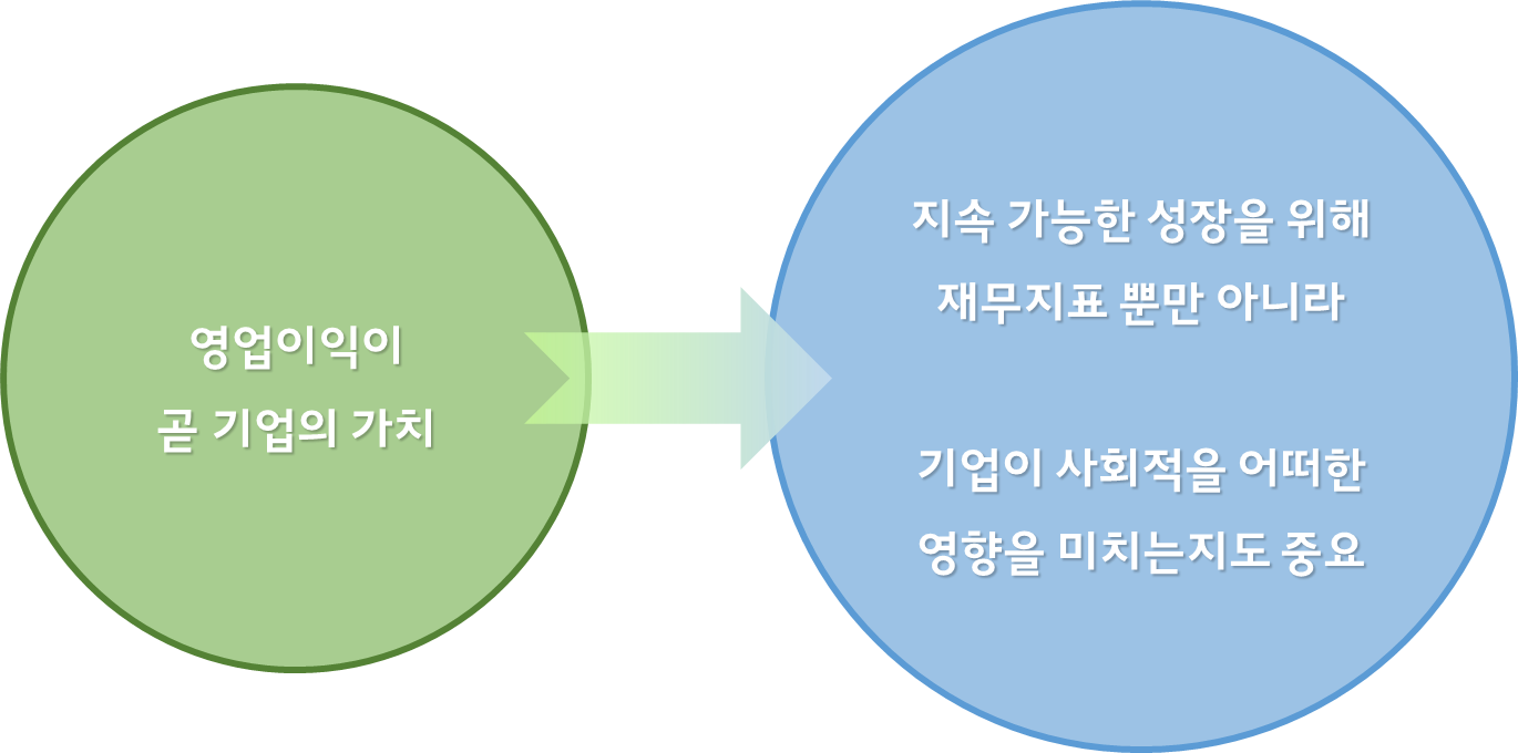 과거에는 기업을 평가함에 있어서 얼마를 투자해서, 얼마를 벌었는가?를 중심으로 매출이나 영업이익, 현금흐름 등 재무적인 정량 지표를 기준으로 사용했습니다. 그러나 기후변화 등 최근 기업이 사회에 미치는 영향력이 증가하면서, 비재무적인 지표가 기업의 실질적인 가치 평가 있어 더 중요할 수 있다는 인식이 퍼지게 되었습니다.