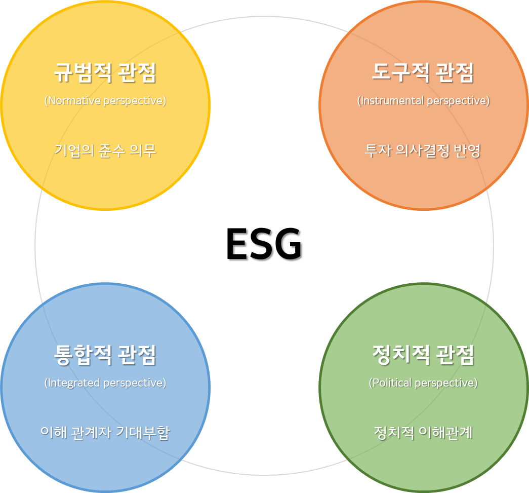 ESG 정의는 기관별 설립 목적 및 사업의 특성, 이해관계자의 차이에 따라 다양하게 제시되고 있습니다. 공통적으로 제시되는 키워드는 결정 ∙ 장기적인 수익 ∙ 재무적인 가치 ∙ 경영 리스크 ∙ 사회책임 ∙ 지속가능성 등으로, 자본시장에서 집중해야 할 ESG 개념은 ‘투자의사결정 및 장기적인 재무적 가치에 영향을 미칠 수 있는 중요한 비재무적 요인’ 입니다. 그리고 이런 ESG 개념은 규범ㆍ통합ㆍ도구ㆍ정치적 관점으로 해석될 수 있습니다.