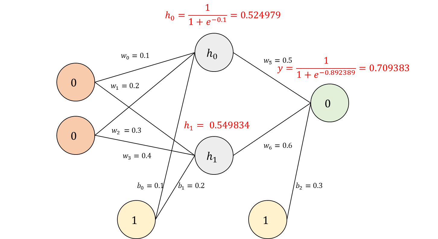 입력을 0, 0으로 출력이 0이면서 활성화 함수는 시그모이드 함수를, 가중치와 바이어스를 임의로 설정했을 때 예시를 계산해 보겠습니다.