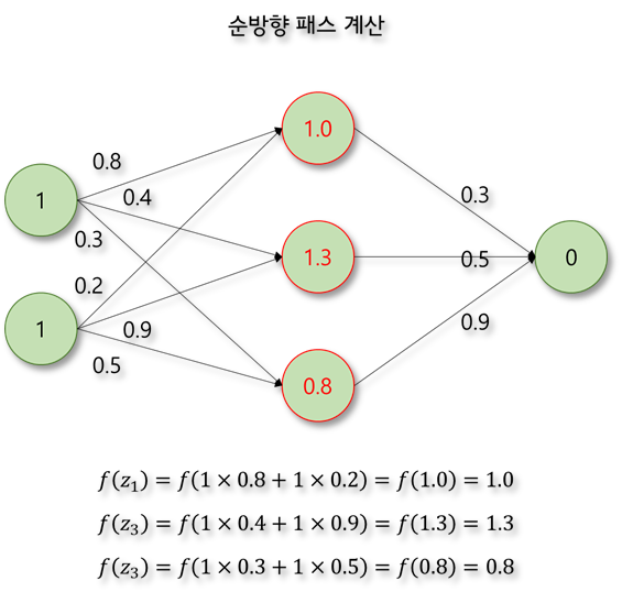 입력층에 주어진 입력을 순방향으로 전파시켜 출력을 계산한다.