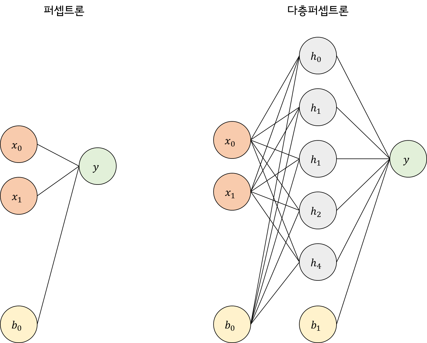 다층 퍼셉트론(MLP)은 입력층과 출력층 사이에 은닉층이라는 새로운 층을 가지고 있는 퍼셉트론을 말합니다. 기존의 퍼셉트론의 경우 한 개의 뉴런 구조만을 가진 단순한 형태였으며, XOR을 학습하지 못하는 등의 한계점이 있었습니다. 연구자들은 우리의 뇌가 수백만 개의 뉴런들로 이루어져 있듯이 조금 더 복잡한 형태의 신경망을 만들어 퍼셉트론의 한계를 극복하고자 하였고, 그 결과 여러 개의 뉴런들이 이어진 형태의 다층 퍼셉트론이 만들어지게 되었습니다.