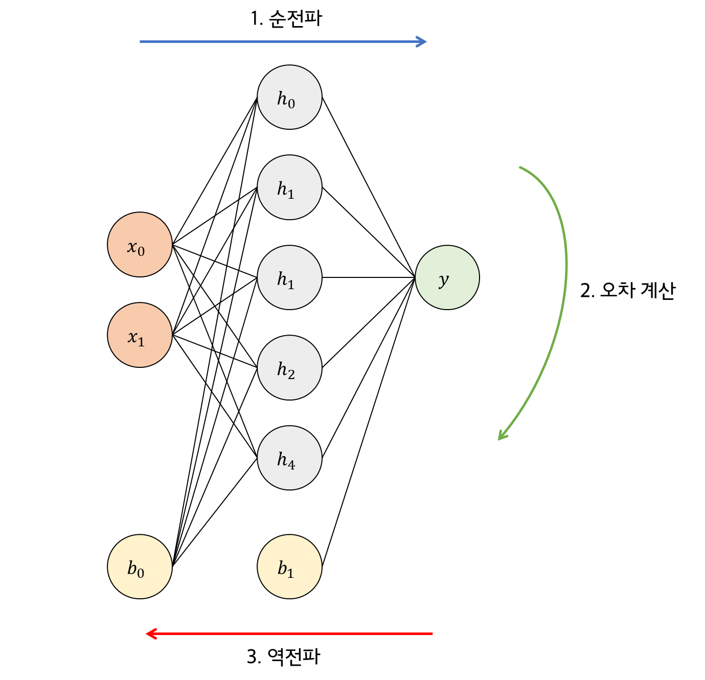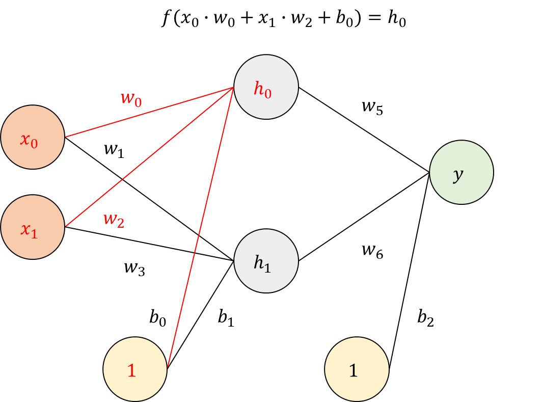 순전파 알고리즘부터 살펴보겠습니다. 기존의 퍼셉트론의 출력 계산 방법과 동일합니다. 입력값과 바이어스 값을 곱하고 활성화 함수를 통해 출력값을 계산하면 됩니다. 아래 구조를 예시로 \(h_{0}\)을 계산하면 다음과 같습니다.