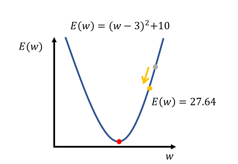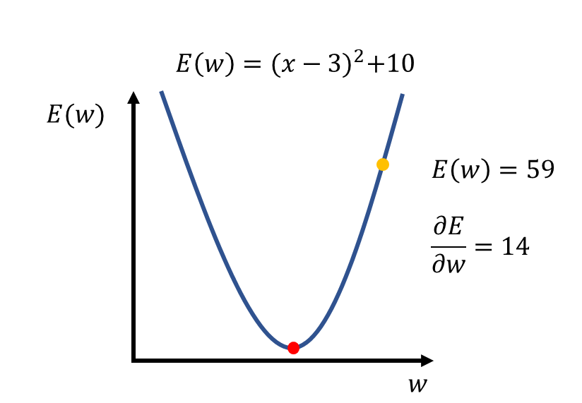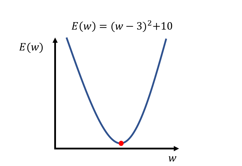 예를 들어보겠습니다. 다음과 같이 가중치 \(w\)에 대한 손실함수 \(E(w)\)가 있습니다. 앞서 말했다시피 우리의 목적은 손실함수의 최솟값을 가지는 \(w\)를 찾는 것입니다.